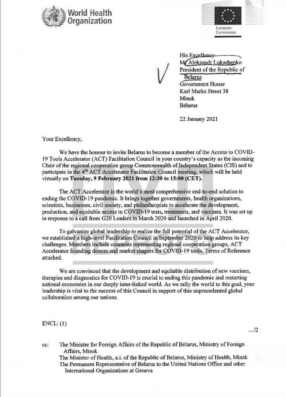Чуть позже «Пул первого» продемонстрировал фото письма белорусского Минздрава, адресованного генеральному директору Всемирной организации здравоохранения Тедросу Аданому Гебрейесусу и председателю Европейской комиссии Урсуле фон дер Ляйен, подписанное министром Г.Л.Пиневичем.