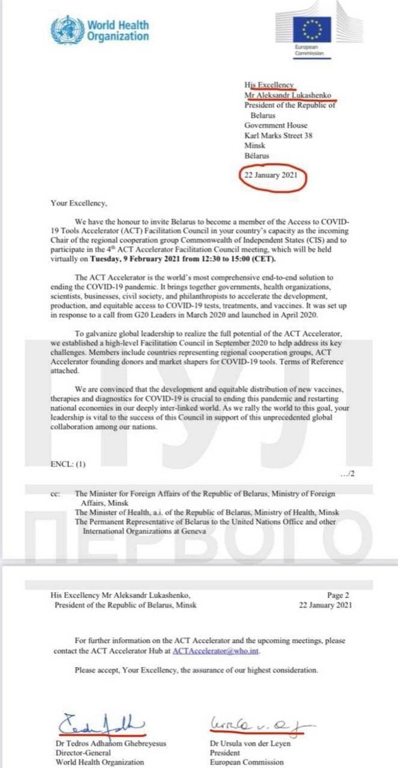 Под письмом такое пояснение: А вот и то самое письмо! Your Exellency, пишут обращаясь к Лукашенко Урсула фон дер Ляйен и генеральный директор ВОЗ Тедрос Гебрейесус. Как видно, письмо отправлено 22 января. А пресс-секретарю Петеру Стано советуем учить матчасть.