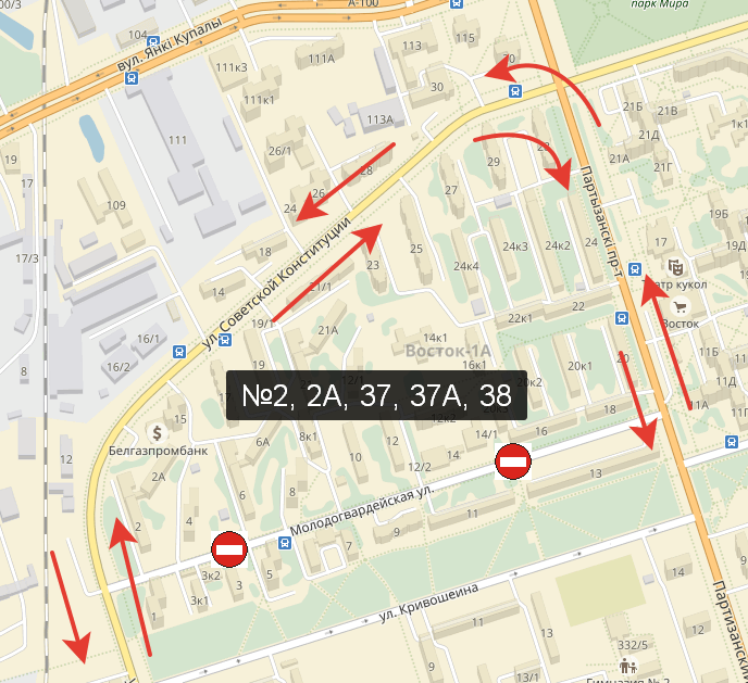 На время производства работ автобусы №№2, 2А, 37, 37А, 38 будут двигаться по ул. Московской – ул. Советской Конституции – Партизанскому проспекту в прямом и обратном направлениях.