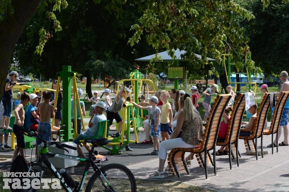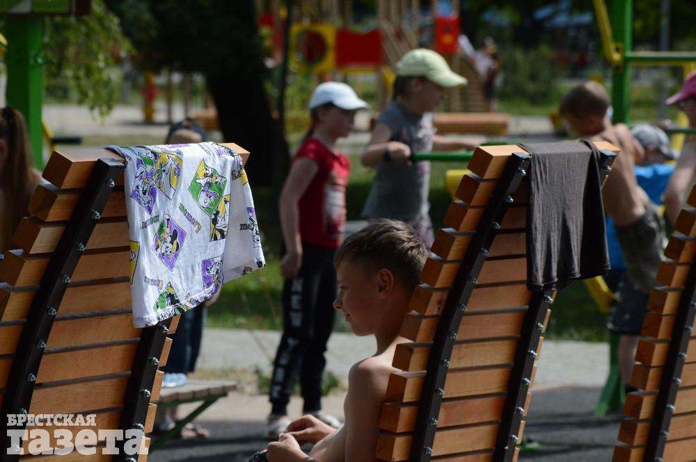 Немало ребятишек на спортивной площадке на набережной. Детям не мешает развлекаться даже то, что тренажеры находятся на открытой площадке, где почти нет тени.