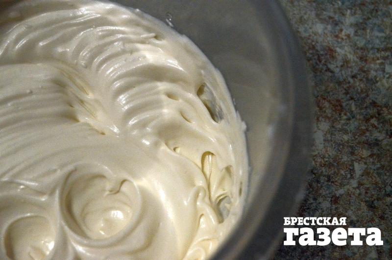 Надо: для печенья: 2 яйца, 2 ст. л. меда, 50 г муки, 1 ст. л. кофе; для крема: 300 г мягкого творога.