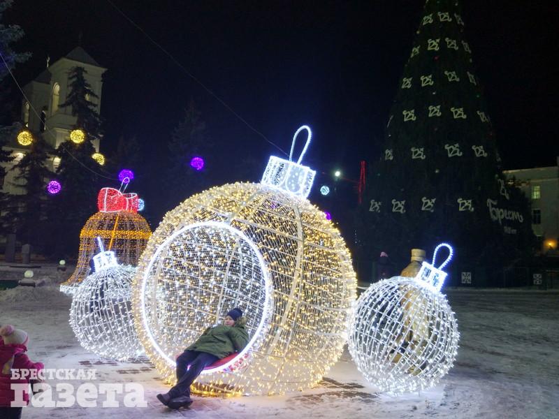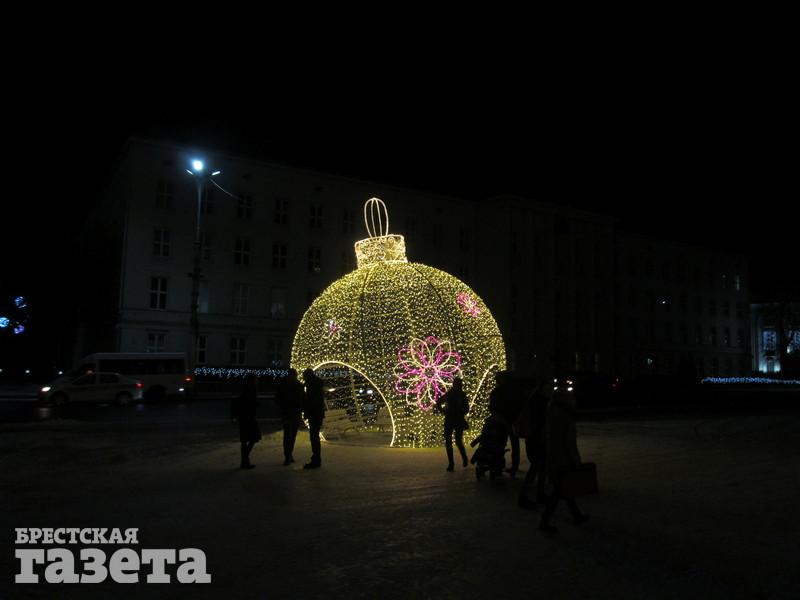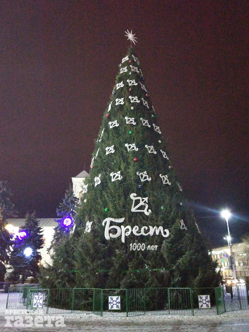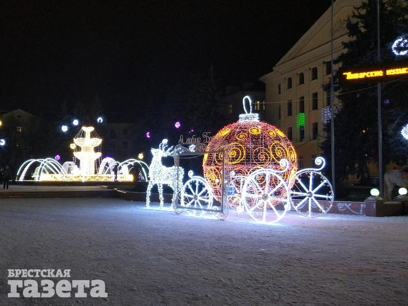 Сейчас можно увидеть, что елку украсили логотипами к 1000-летию Бреста, но она пока не светится. На площади уже установили карету, запряженную оленем, новогодний шар, колокольчик с язычком, который двигается из стороны в сторону.