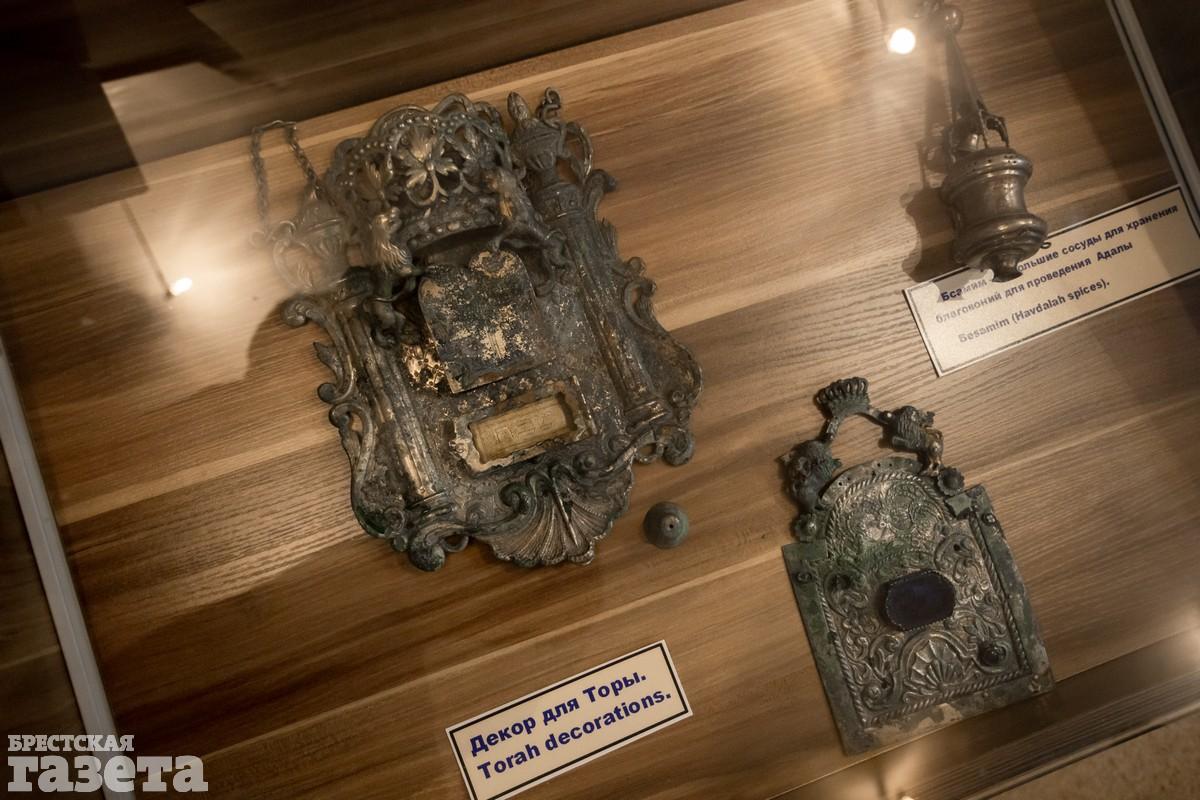 • Самые значимые экспонаты – не всегда самые приметные. Декор для Торы был обнаружен строителями и совершенно случайно попал в музей. Когда металлическое украшение вытащили из земли оно не выглядело чем-то ценным. Сейчас декор занимает почетное место на музейной витрине под стеклом. Рядом лежит коробочка для бесамим с колокольчиками. Этот небольшой сосуд для хранения благовоний используется во время обряда Авдала, символизирующего завершение Шабата. На коробочке в музее значится надпись, что она из Бреста.