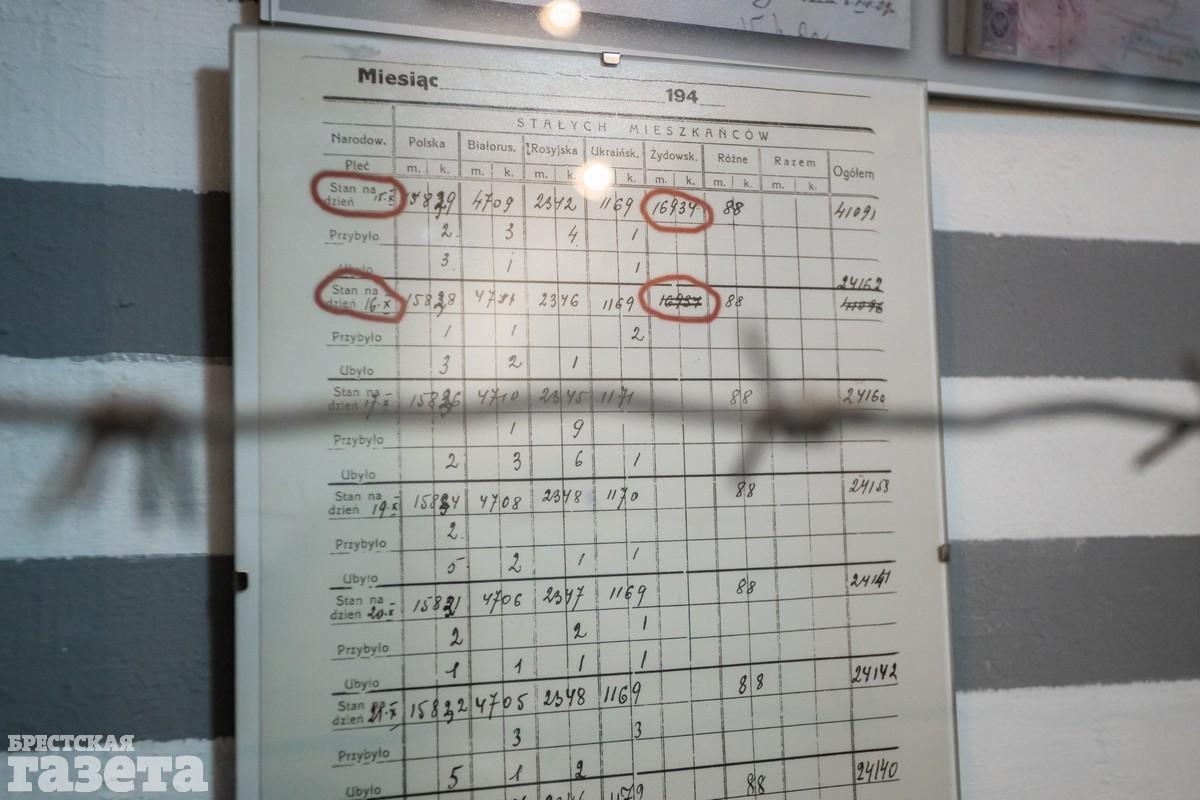 • В уголке холокоста есть копия страницы книги учета движения и контроля населения города Бреста. В ней установлена дата уничтожения брестского гетто. За сухими цифрами скрыта большая трагедия: один день и больше шестнадцати тысяч человеческих жизней.