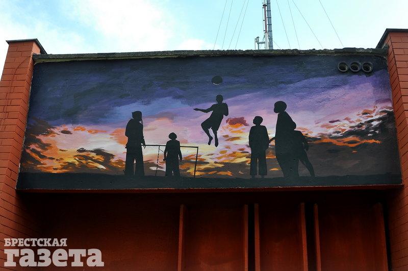 На фасаде, обращенном на дворовое футбольное поле, — силуэты детей, гоняющих футбольный мяч.