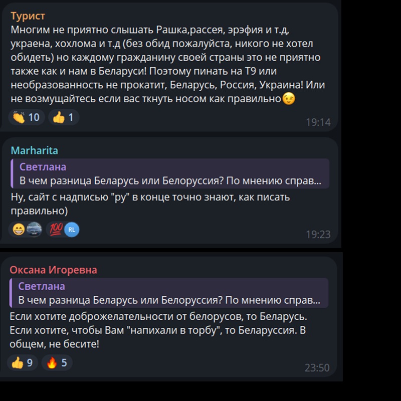 «Если хотите доброжелательности от белорусов, то Беларусь. Если хотите, чтобы Вам «напихали в торбу», то Беларуссия. В общем, не бесите!»